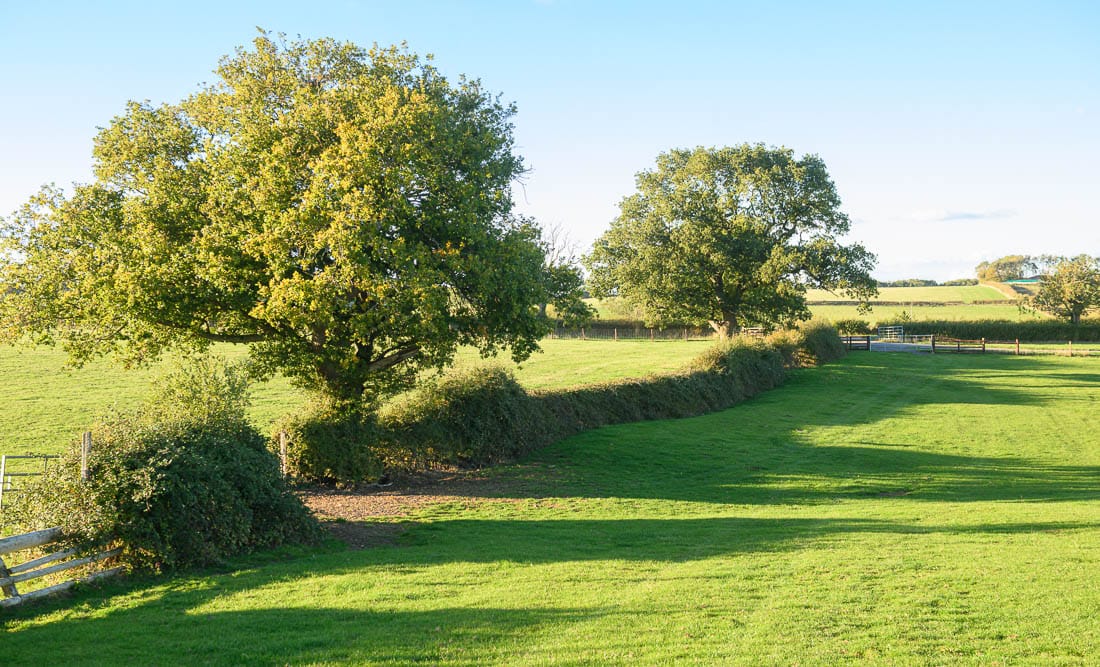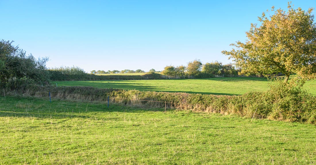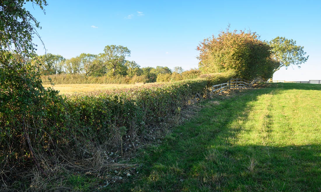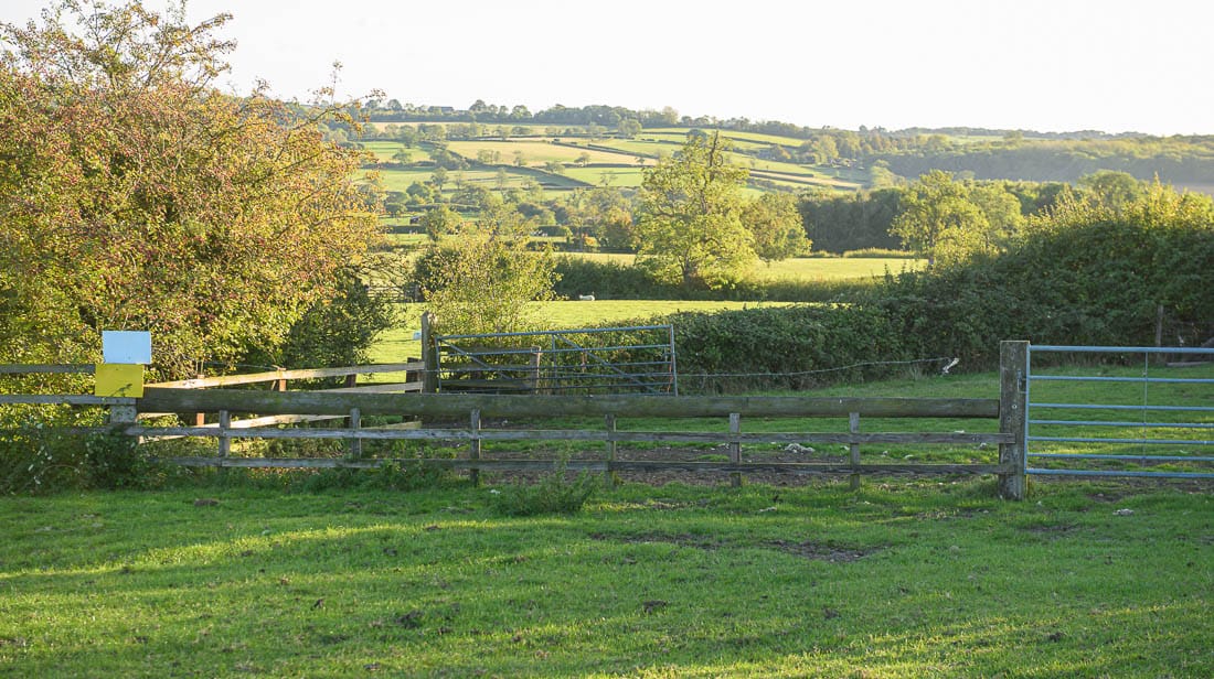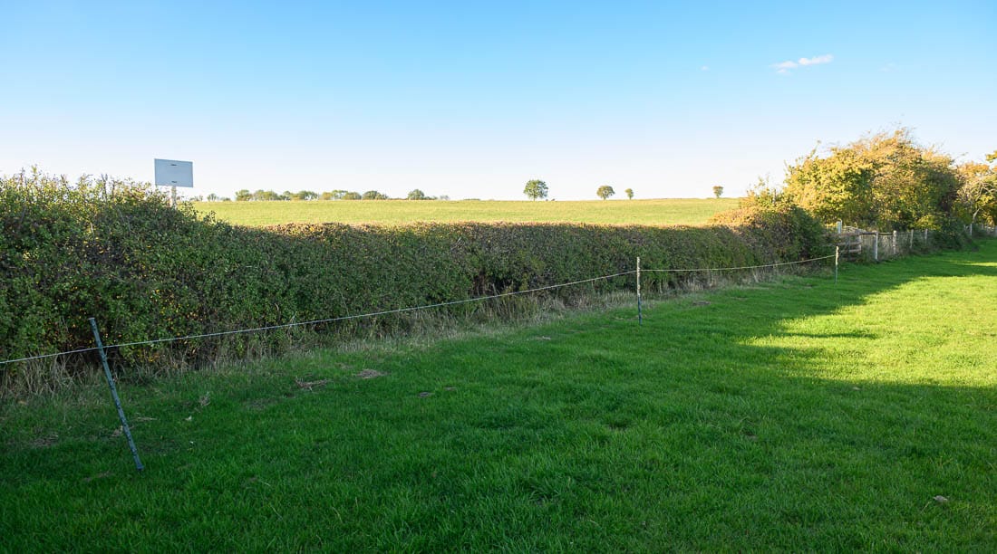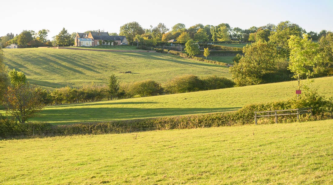 The first half of the Bleak House loop brings you right to left across the hedge on the far right of this image, where there is a left-hand marker, then across the field below the house, and across the hedge on the far left of this image. The course then heads to the bottom of the hill again to a set of rails where there is another left-hand marker.