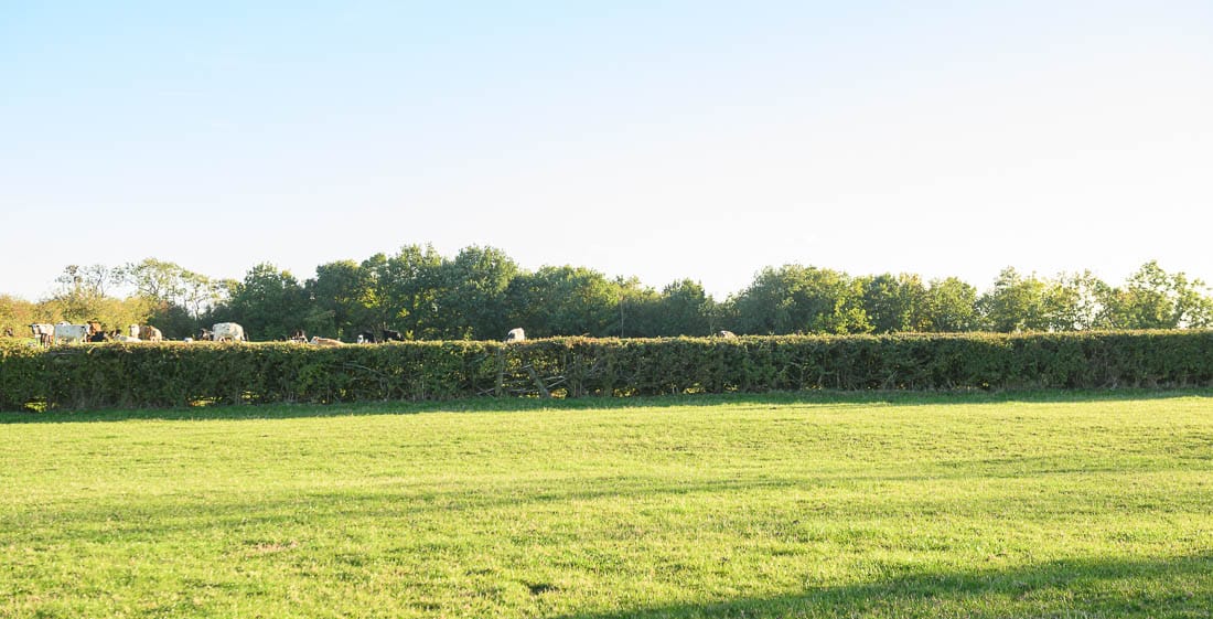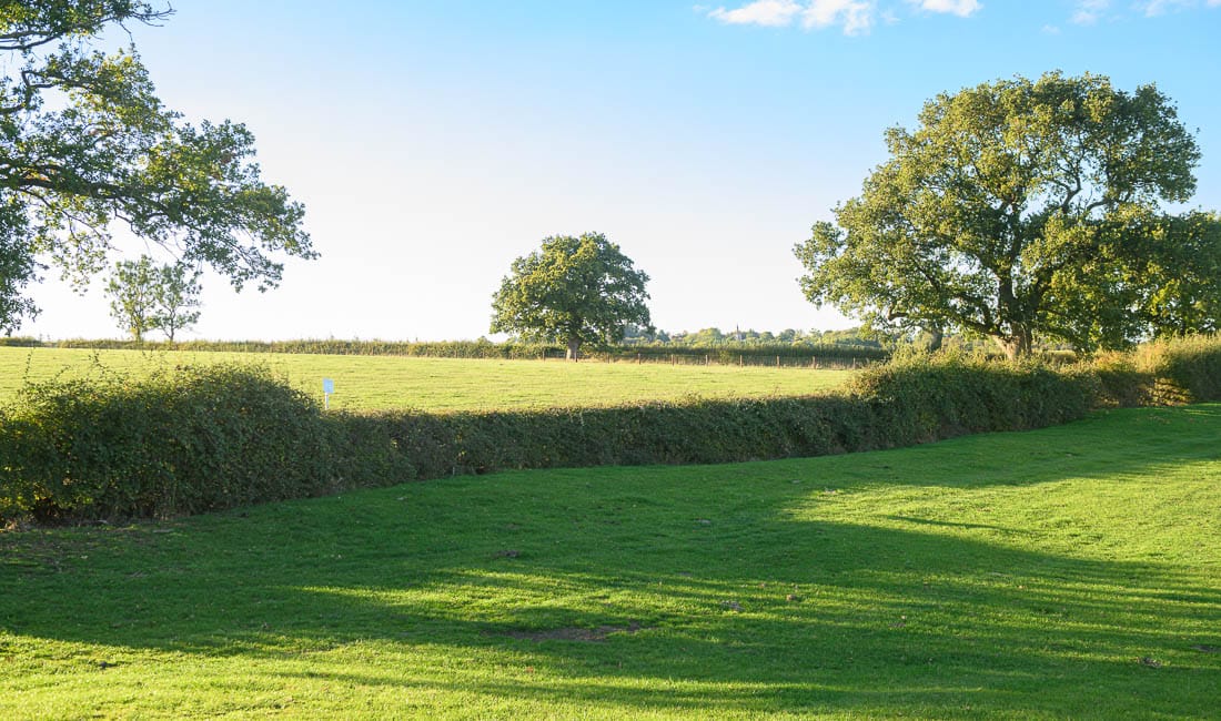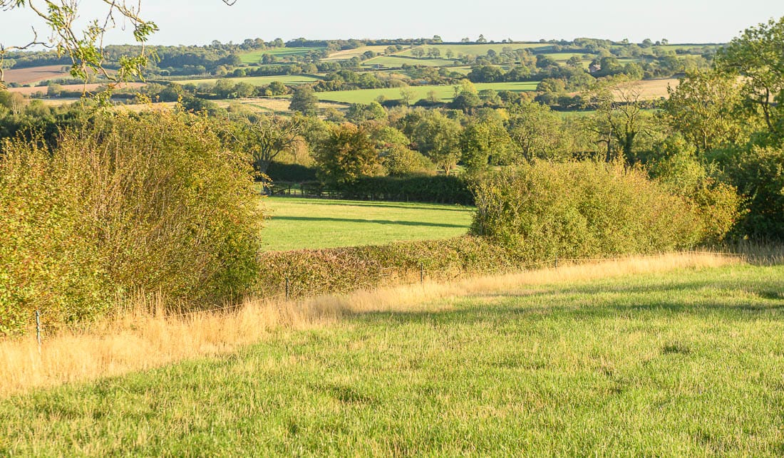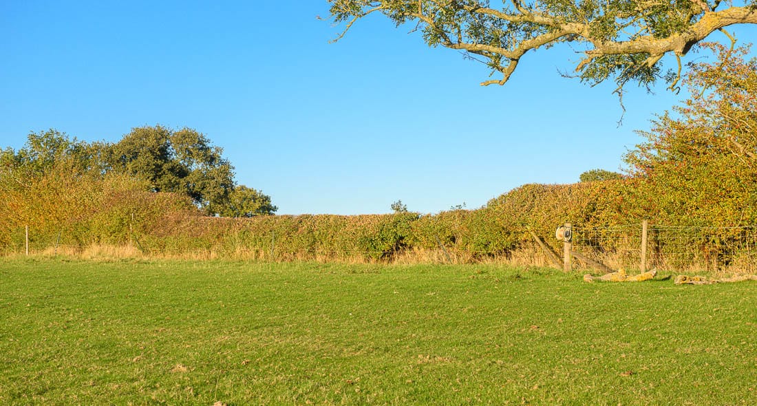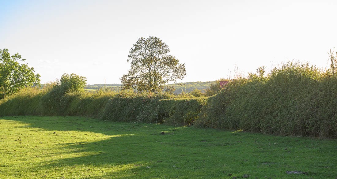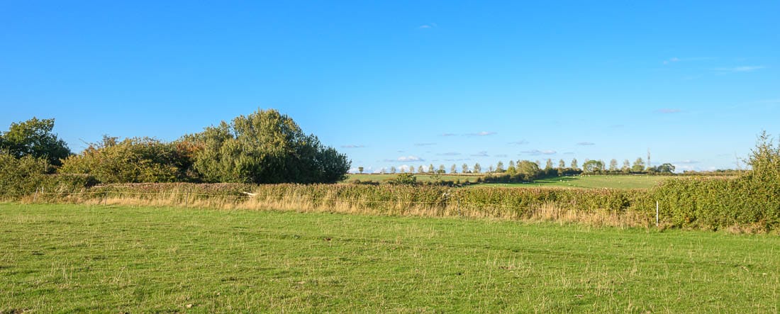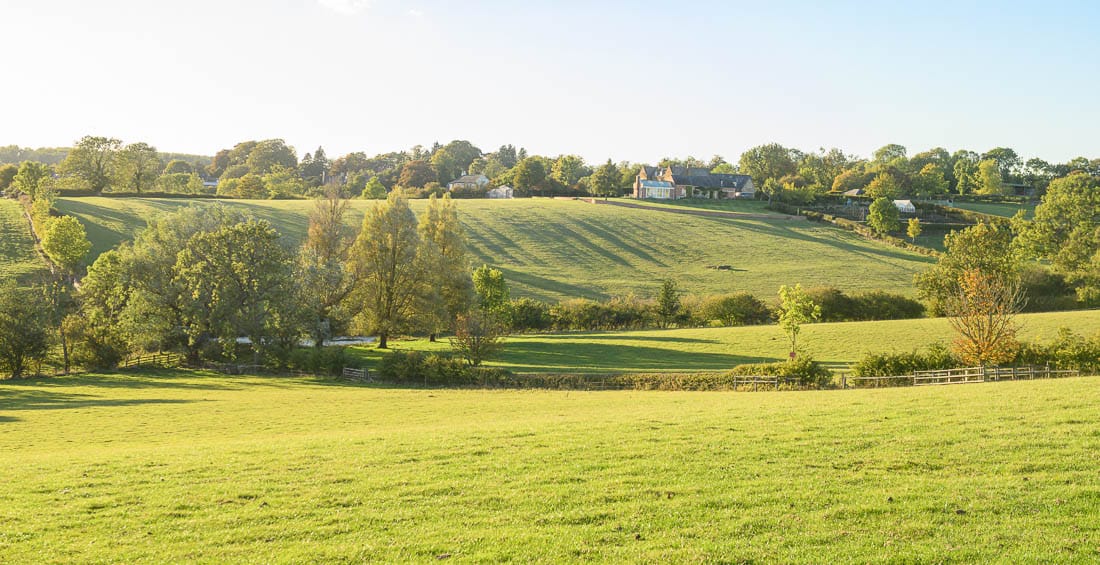 The first half of the Bleak House loop brings you right to left across the hedge on the far right of this image, where there is a left-hand marker, then across the field below the house, and across the hedge on the far left of this image. The course then heads to the bottom of the hill again to a set of rails where there is another left-hand marker.