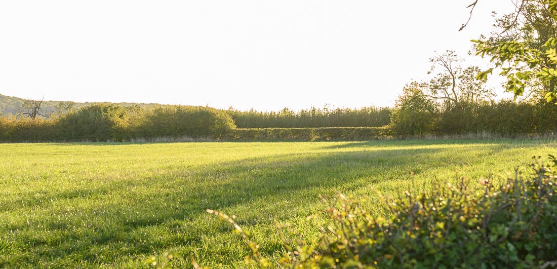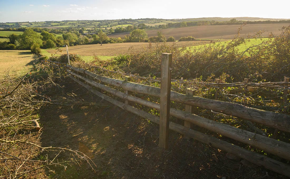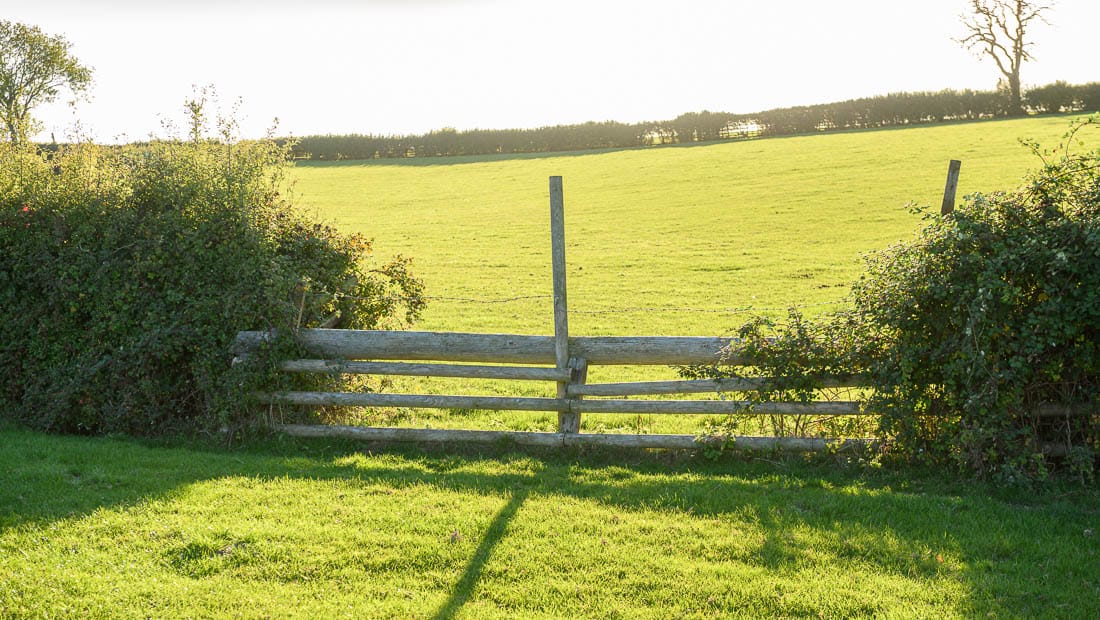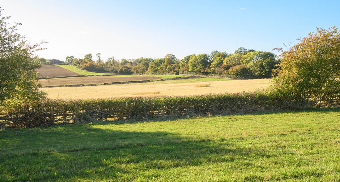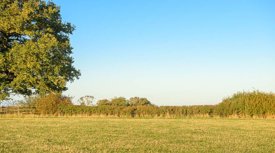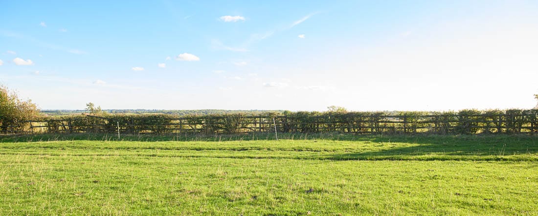 The first half of the Bleak House loop brings you right to left across the hedge on the far right of this image, where there is a left-hand marker, then across the field below the house, and across the hedge on the far left of this image. The course then heads to the bottom of the hill again to a set of rails where there is another left-hand marker.