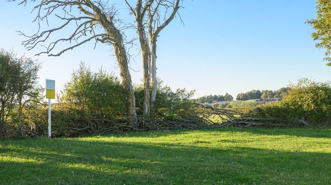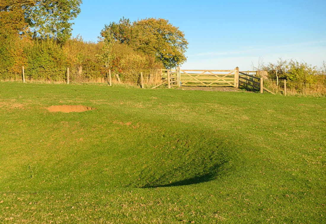 The course now separates from the Scurry course and heads slightly right, uphill to an open gate, after which there is a large crater in the ground which should be avoided.